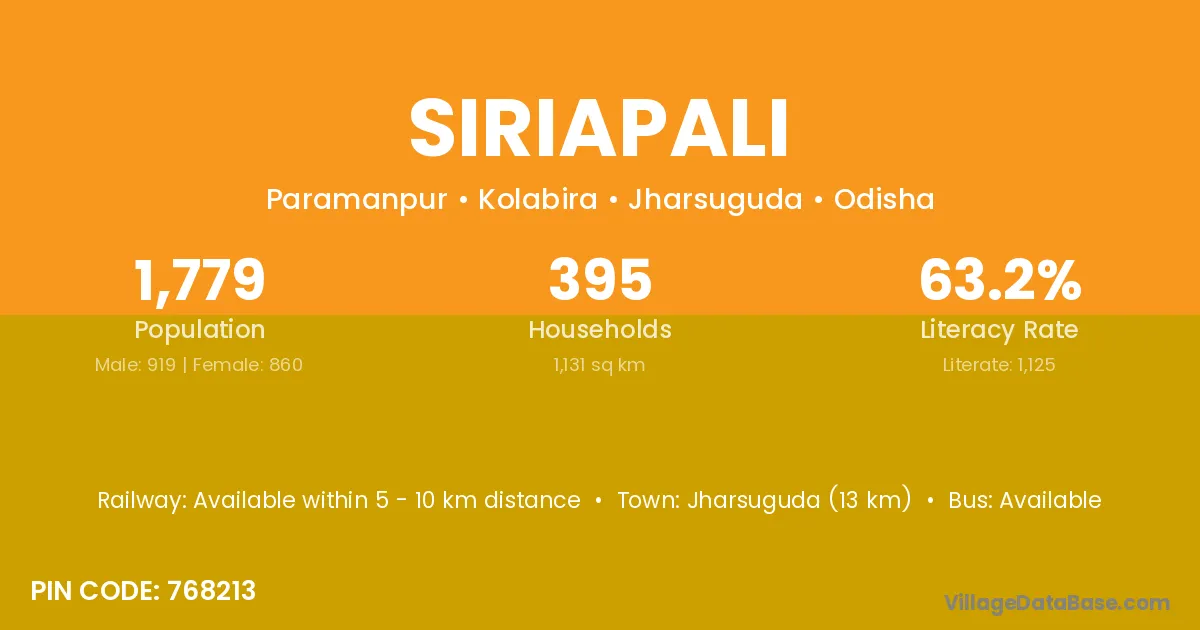Jharsuguda (13 km) is the nearest town to Siriapali village for major economic activities and is located approximately 13 km away.