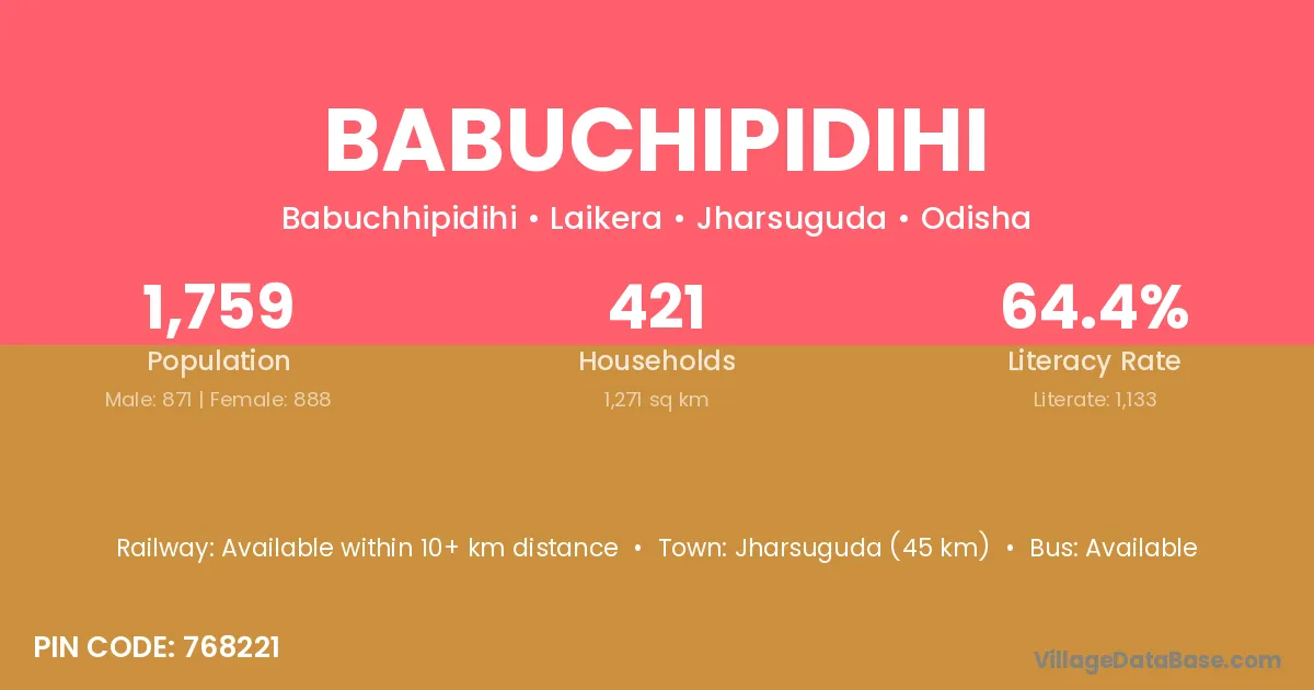 Jharsuguda (45 km) is the nearest town to Babuchipidihi village for major economic activities and is located approximately 45 km away.