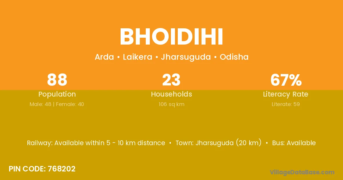Jharsuguda (20 km) is the nearest town to Bhoidihi village for major economic activities and is located approximately 20 km away.