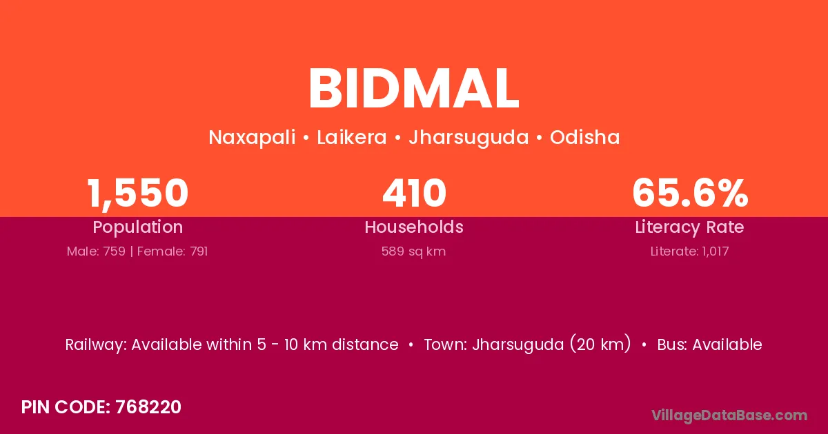 Jharsuguda (20 km) is the nearest town to Bidmal village for major economic activities and is located approximately 20 km away.