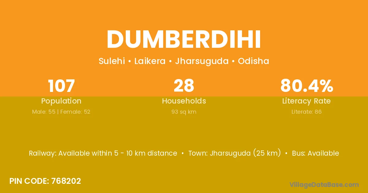 Jharsuguda (25 km) is the nearest town to Dumberdihi village for major economic activities and is located approximately 25 km away.
