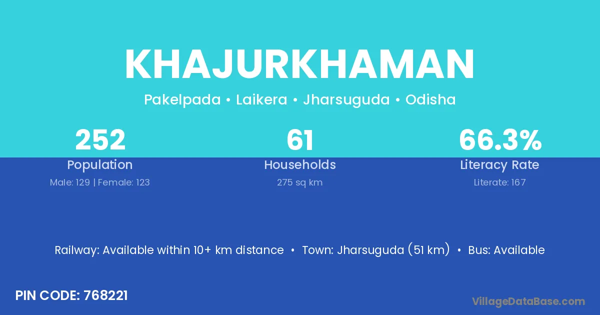Jharsuguda (51 km) is the nearest town to Khajurkhaman village for major economic activities and is located approximately 51 km away.