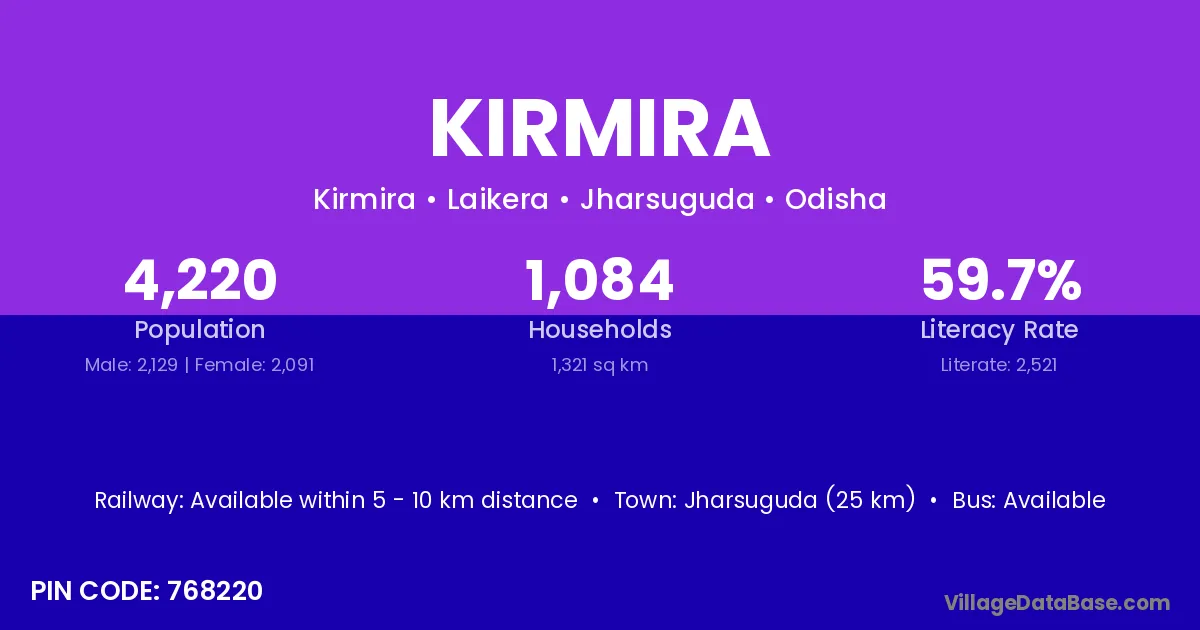 Jharsuguda (25 km) is the nearest town to Kirmira village for major economic activities and is located approximately 25 km away.
