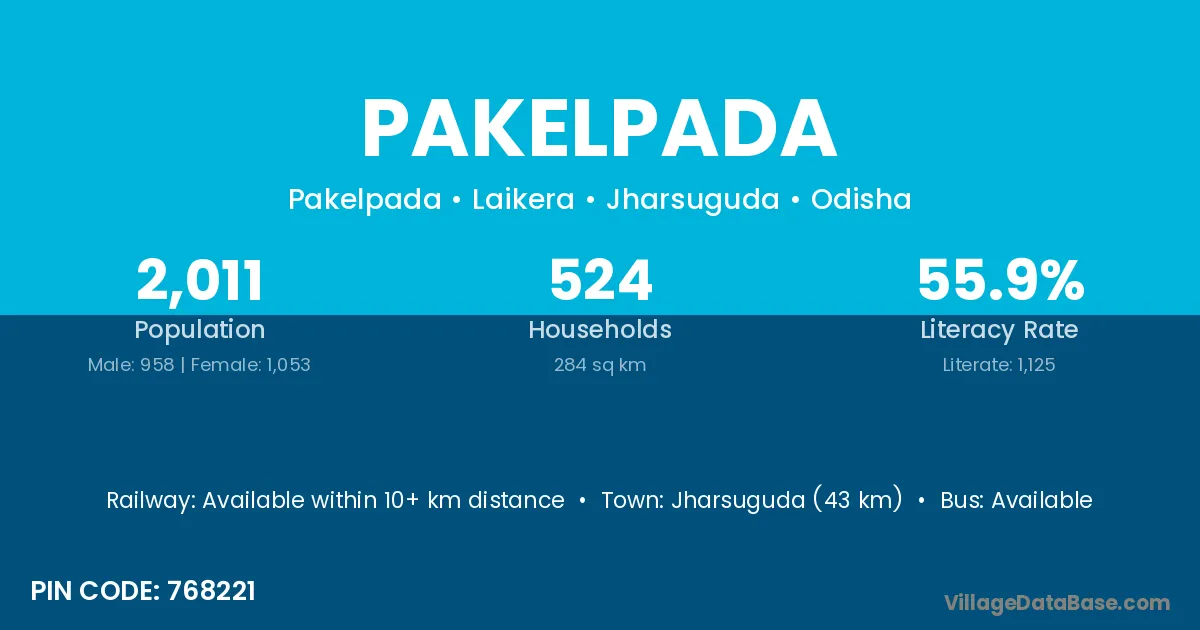 Jharsuguda (43 km) is the nearest town to Pakelpada village for major economic activities and is located approximately 43 km away.