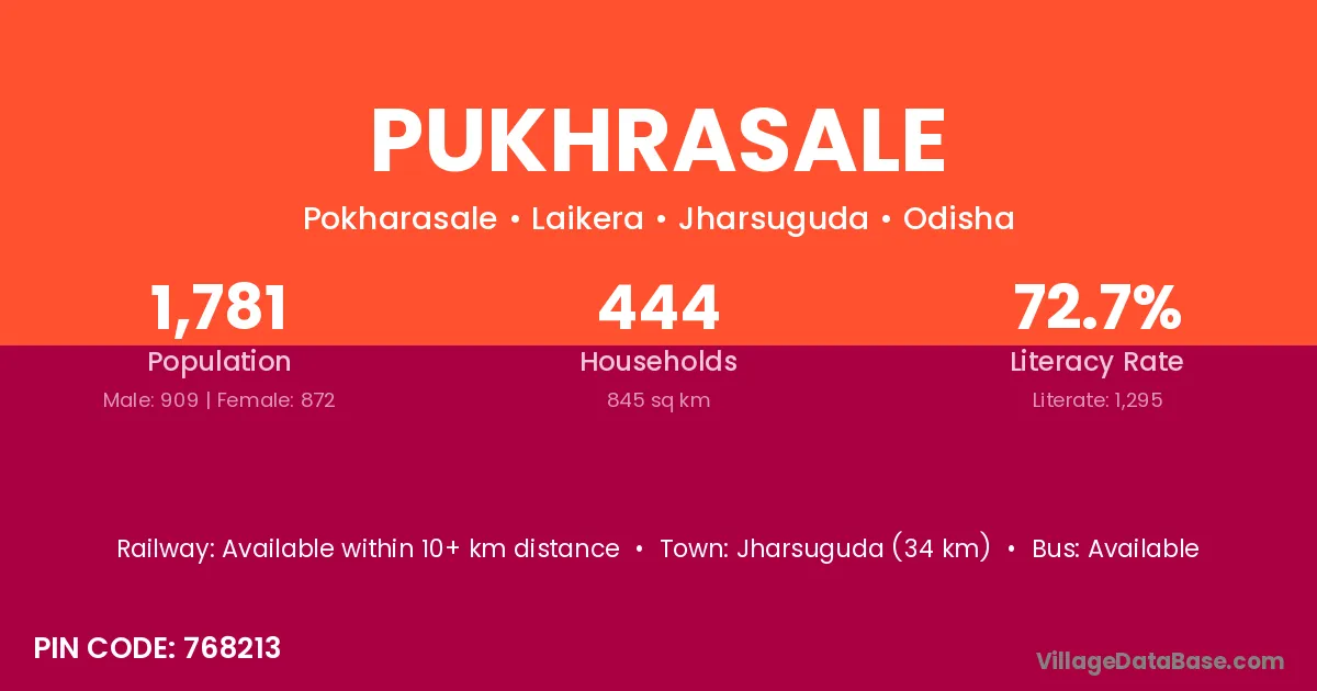 Jharsuguda (34 km) is the nearest town to Pukhrasale village for major economic activities and is located approximately 34 km away.