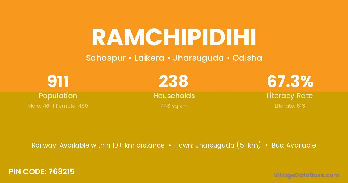 Jharsuguda (51 km) is the nearest town to Ramchipidihi village for major economic activities and is located approximately 51 km away.