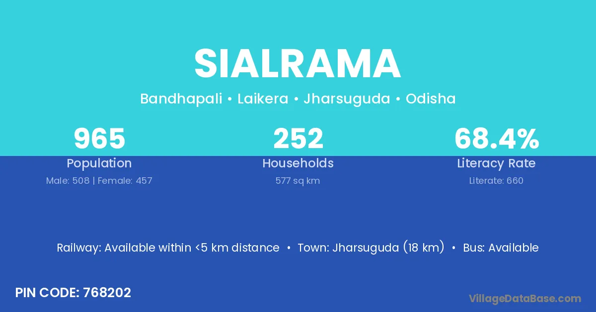 Jharsuguda (18 km) is the nearest town to Sialrama village for major economic activities and is located approximately 18 km away.
