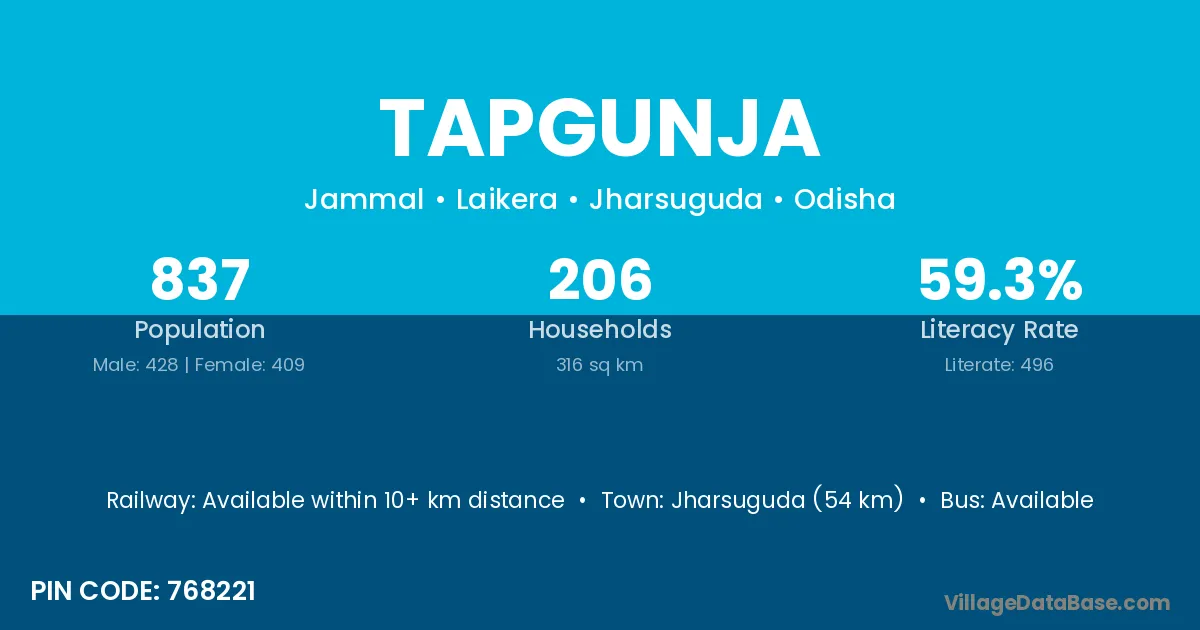 Jharsuguda (54 km) is the nearest town to Tapgunja village for major economic activities and is located approximately 54 km away.