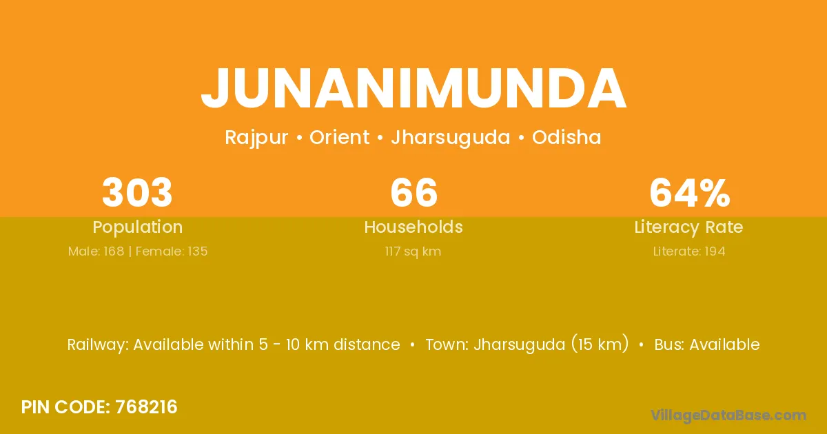 Jharsuguda (15 km) is the nearest town to Junanimunda village for major economic activities and is located approximately 15 km away.