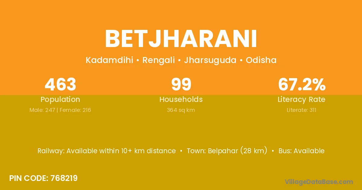 Betjharani village has a total population of 463 people, of which 247 are males and 216 are females.