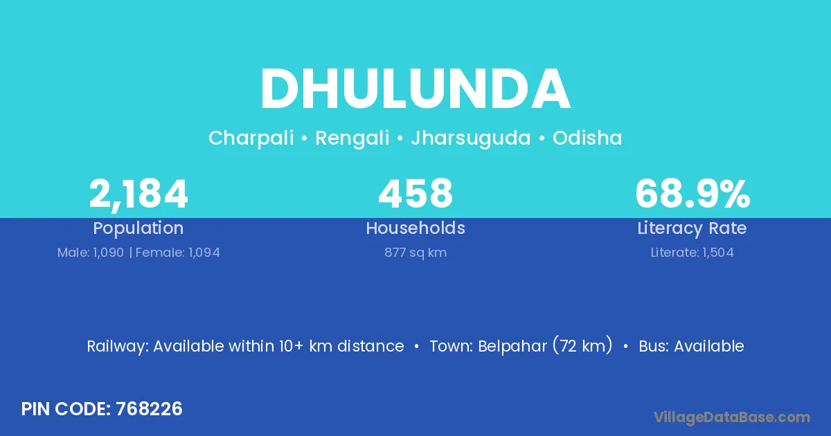 Belpahar (72 km) is the nearest town to Dhulunda village for major economic activities and is located approximately 72 km away.