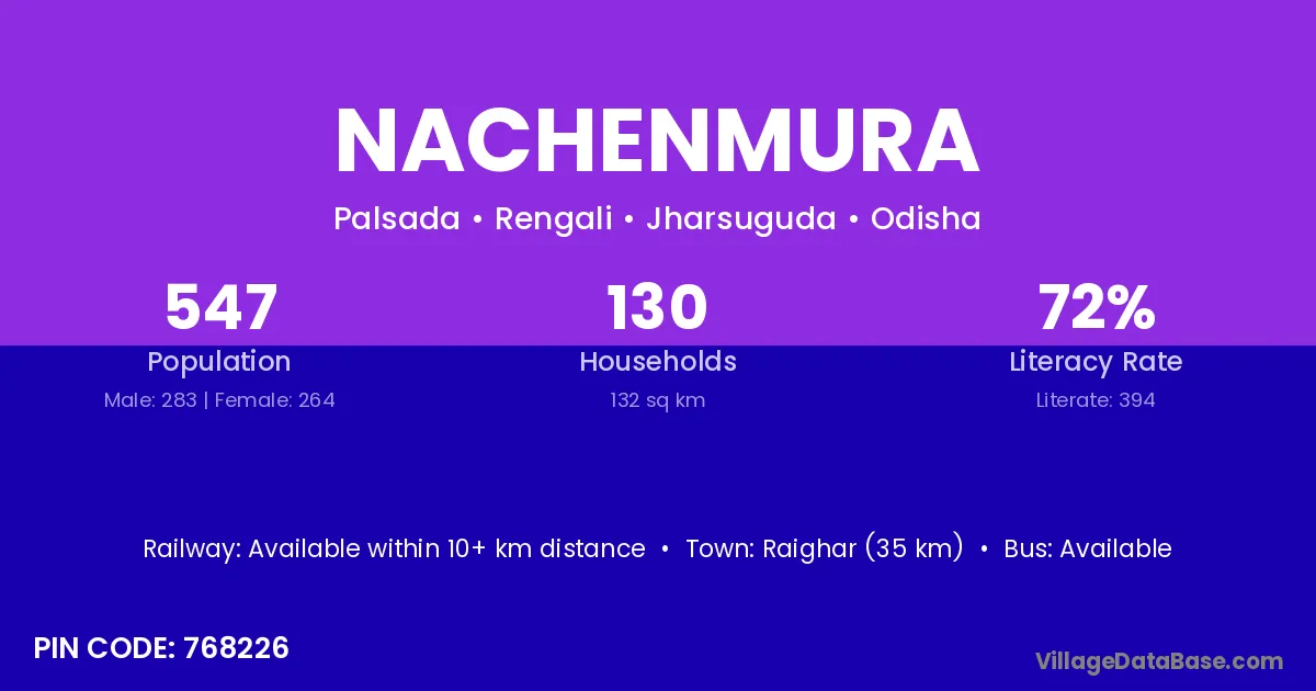 Raighar (35 km) is the nearest town to Nachenmura village for major economic activities and is located approximately 35 km away.