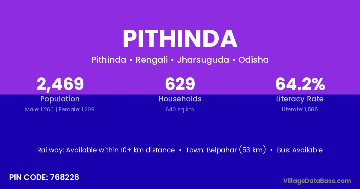 Belpahar (53 km) is the nearest town to Pithinda village for major economic activities and is located approximately 53 km away.