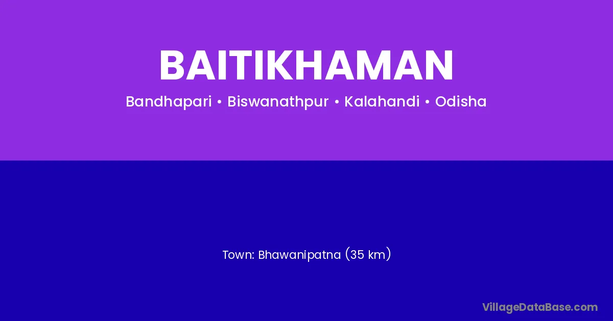 Bhawanipatna (35 km) is the nearest town to Baitikhaman village for major economic activities and is located approximately 35 km away.
