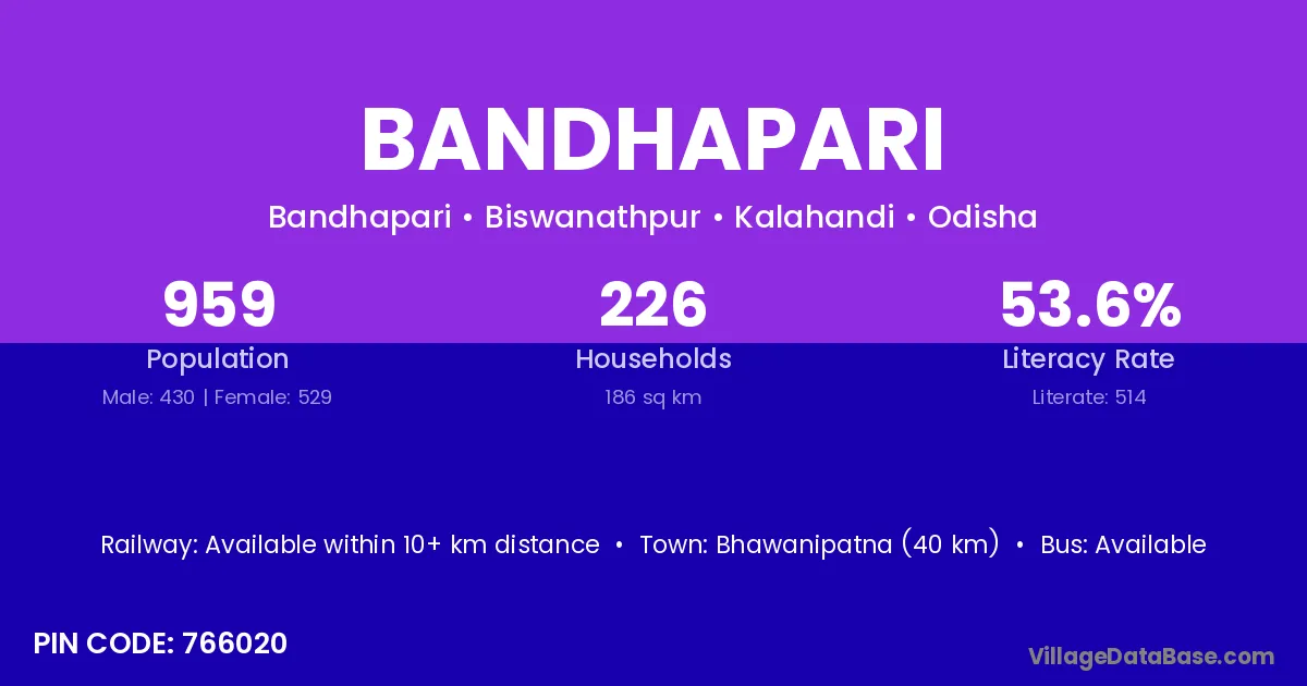 Bhawanipatna (40 km) is the nearest town to Bandhapari village for major economic activities and is located approximately 40 km away.