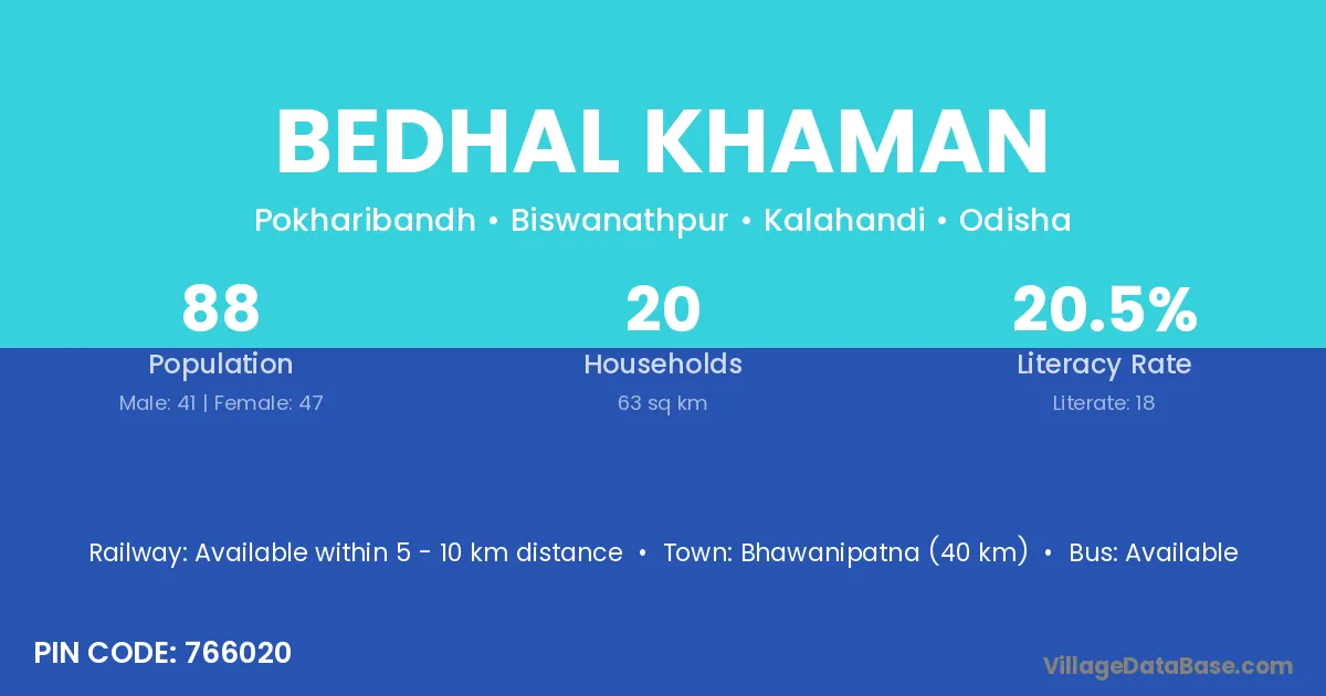 Bhawanipatna (40 km) is the nearest town to Bedhal Khaman village for major economic activities and is located approximately 40 km away.