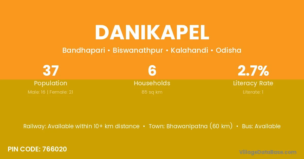 Bhawanipatna (60 km) is the nearest town to Danikapel village for major economic activities and is located approximately 60 km away.