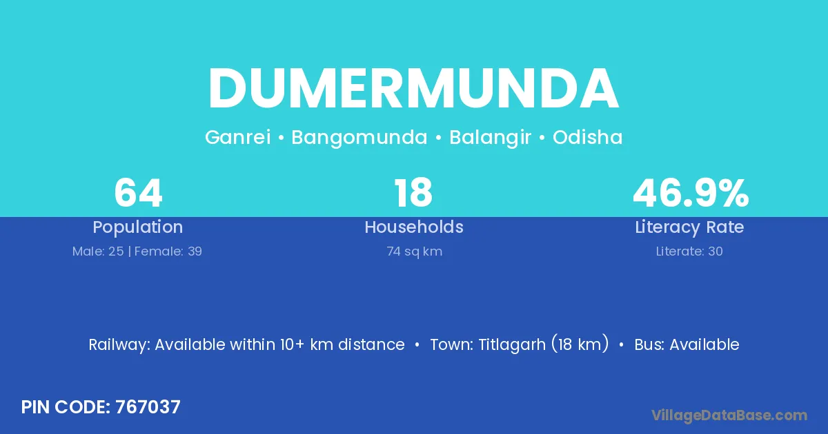 Bhawanipatna (46 km) is the nearest town to Dumermunda village for major economic activities and is located approximately 46 km away.