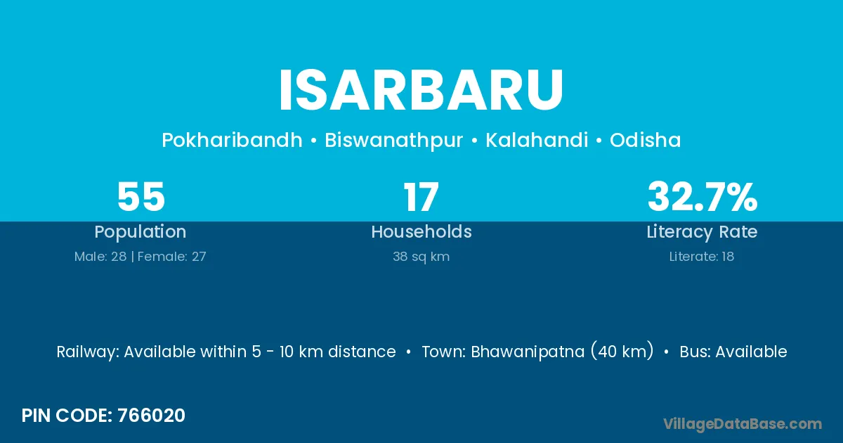 Bhawanipatna (40 km) is the nearest town to Isarbaru village for major economic activities and is located approximately 40 km away.