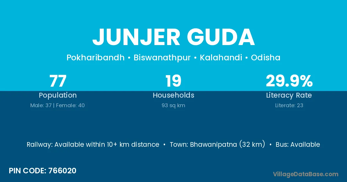 Bhawanipatna (32 km) is the nearest town to Junjer Guda village for major economic activities and is located approximately 32 km away.