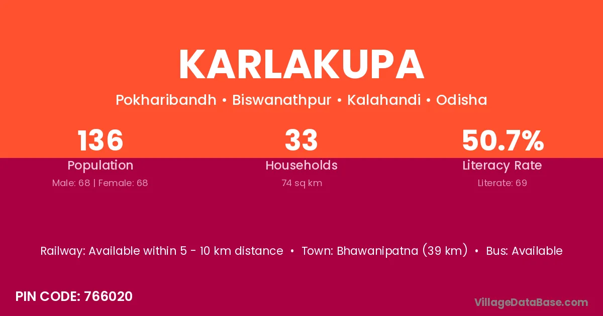 Bhawanipatna (39 km) is the nearest town to Karlakupa village for major economic activities and is located approximately 39 km away.
