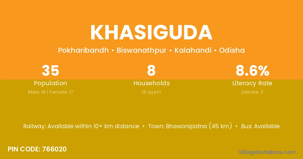 Bhawanipatna (45 km) is the nearest town to Khasiguda village for major economic activities and is located approximately 45 km away.