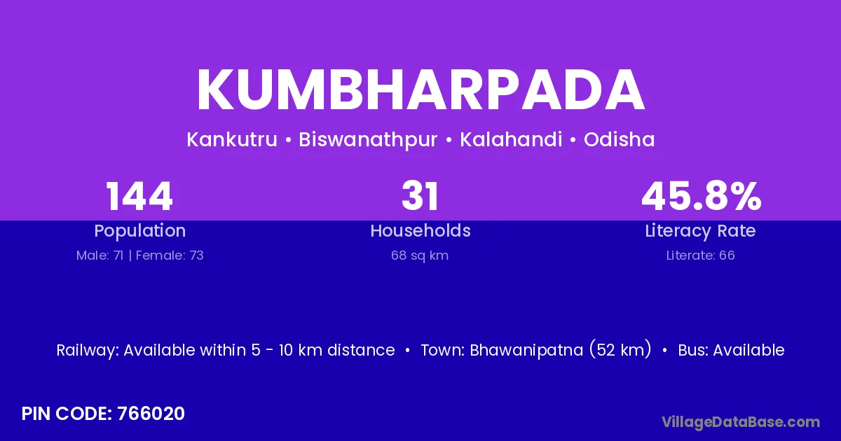 Bhawanipatna (52 km) is the nearest town to Kumbharpada village for major economic activities and is located approximately 52 km away.