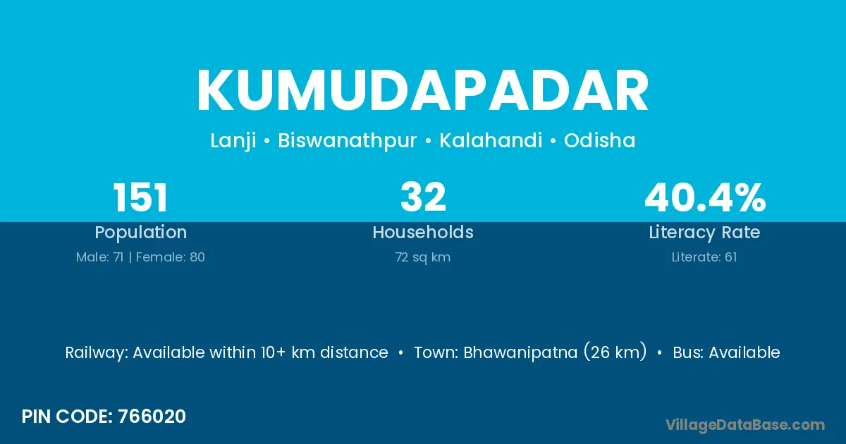 Bhawanipatna (26 km) is the nearest town to Kumudapadar village for major economic activities and is located approximately 26 km away.