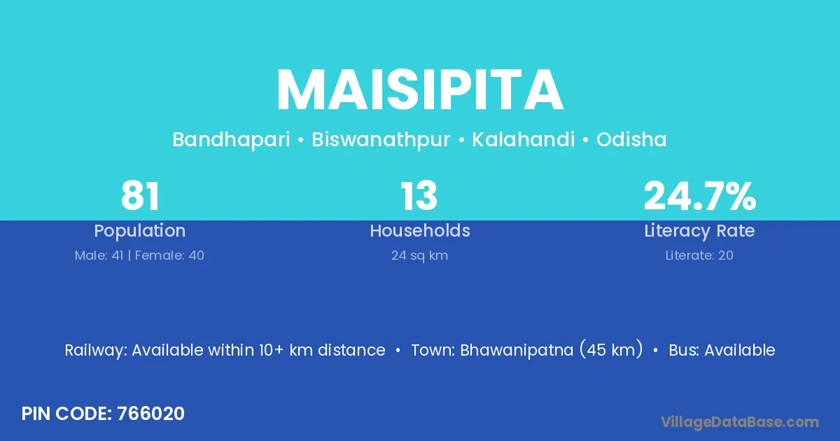 Bhawanipatna (45 km) is the nearest town to Maisipita village for major economic activities and is located approximately 45 km away.