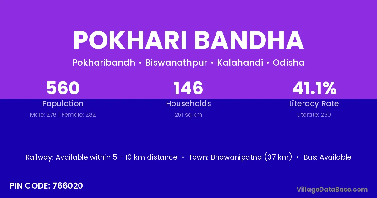 Bhawanipatna (37 km) is the nearest town to Pokhari Bandha village for major economic activities and is located approximately 37 km away.