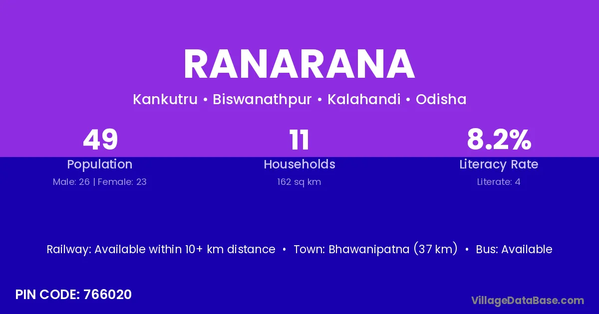 Bhawanipatna (37 km) is the nearest town to Ranarana village for major economic activities and is located approximately 37 km away.