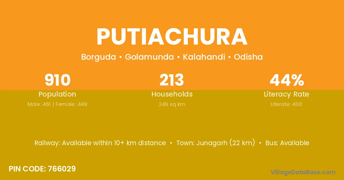 Junagarh (22 km) is the nearest town to Putiachura village for major economic activities and is located approximately 22 km away.