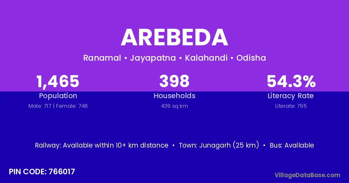 Junagarh (25 km) is the nearest town to Arebeda village for major economic activities and is located approximately 25 km away.