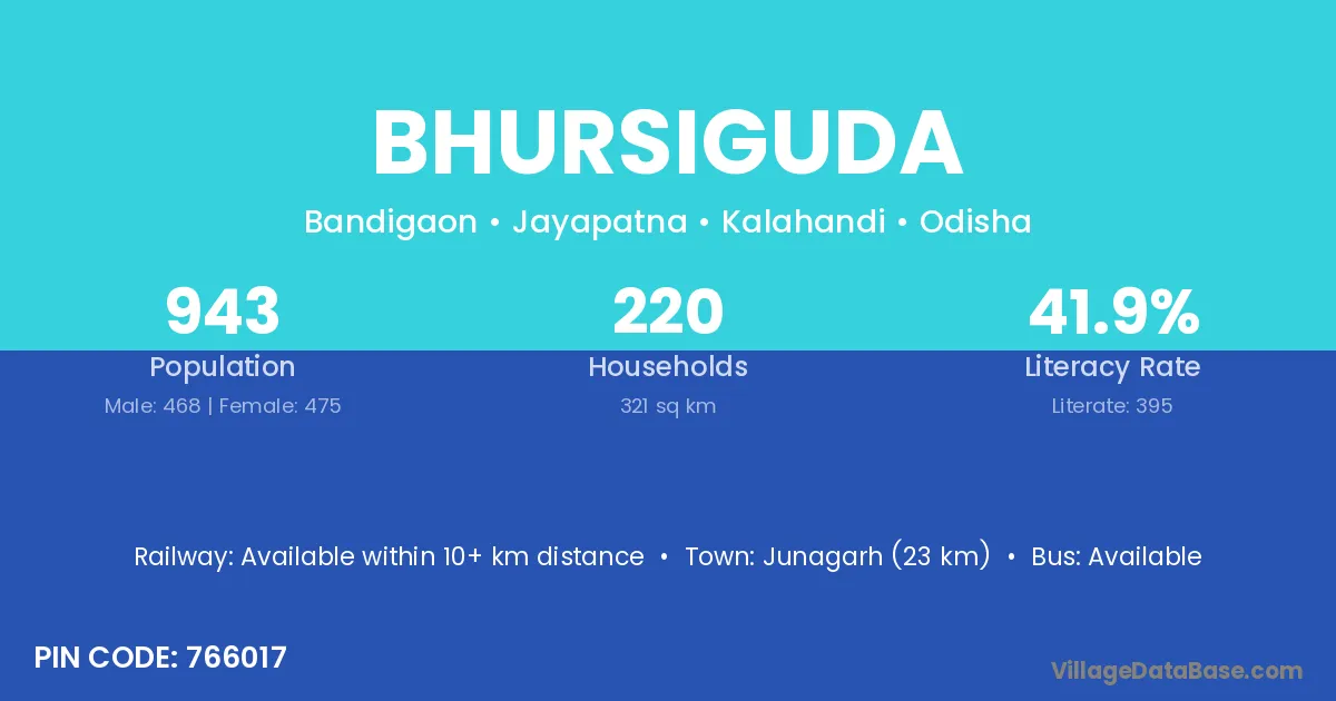 Junagarh (23 km) is the nearest town to Bhursiguda village for major economic activities and is located approximately 23 km away.
