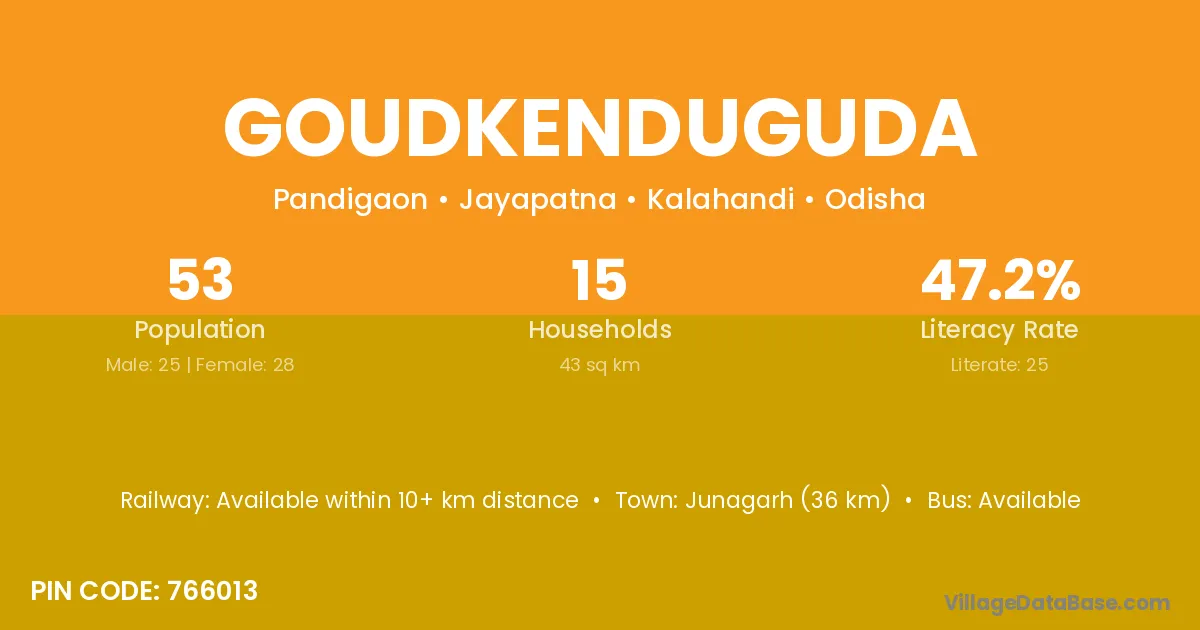 Junagarh (36 km) is the nearest town to Goudkenduguda village for major economic activities and is located approximately 36 km away.