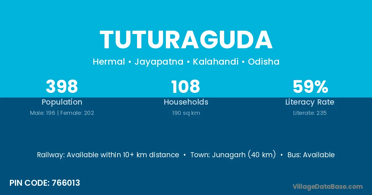 Junagarh (40 km) is the nearest town to Tuturaguda village for major economic activities and is located approximately 40 km away.