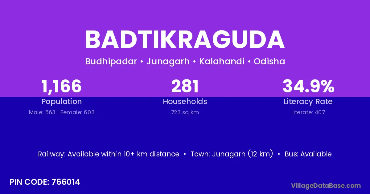 Junagarh (12 km) is the nearest town to Badtikraguda village for major economic activities and is located approximately 12 km away.