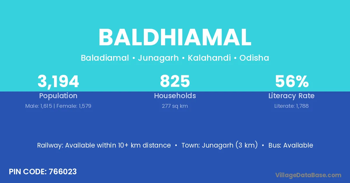 Junagarh (3 km) is the nearest town to Baldhiamal village for major economic activities and is located approximately 3 km away.