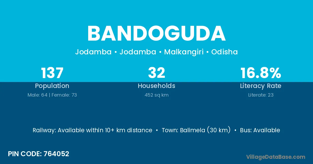Junagarh (13 km) is the nearest town to Bandoguda village for major economic activities and is located approximately 13 km away.