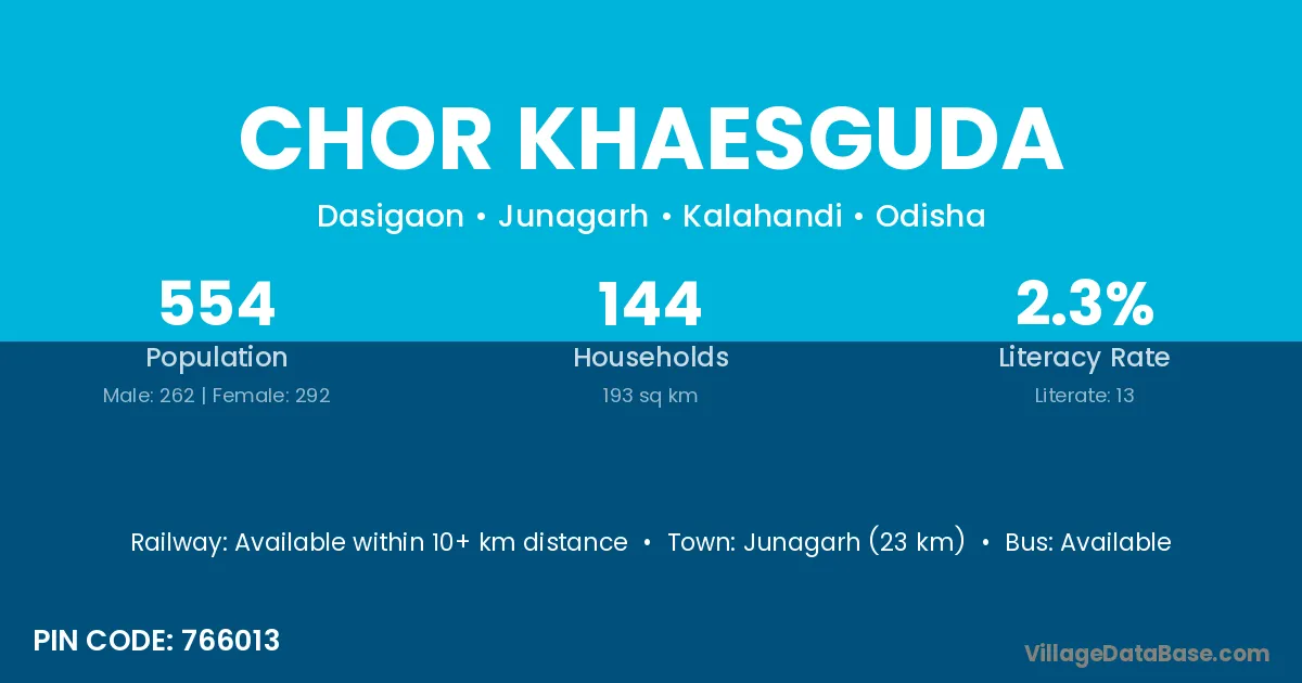 Junagarh (23 km) is the nearest town to Chor Khaesguda village for major economic activities and is located approximately 23 km away.