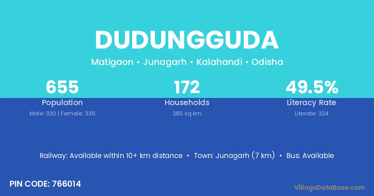 Dudungguda village has a total population of 655 people, of which 320 are males and 335 are females.