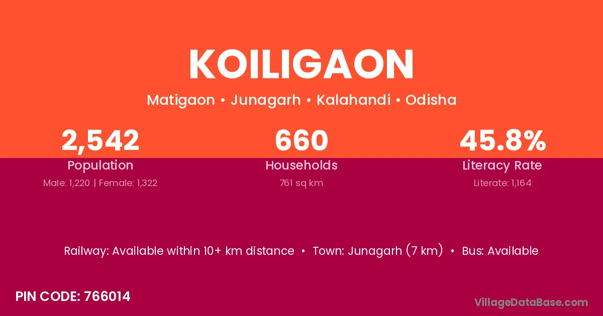 Junagarh (7 km) is the nearest town to Koiligaon village for major economic activities and is located approximately 7 km away.