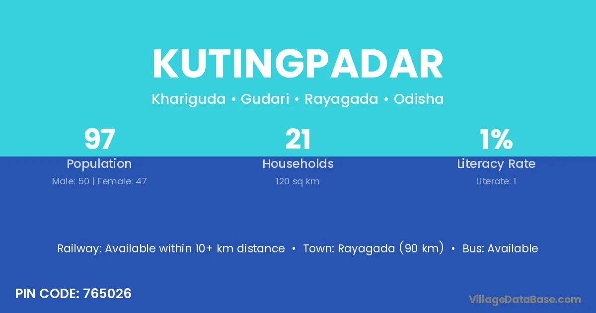 The literacy rate of Kutingpadar village is 28.91%. Male literacy stands at 36.29% and female literacy at 21.08%.