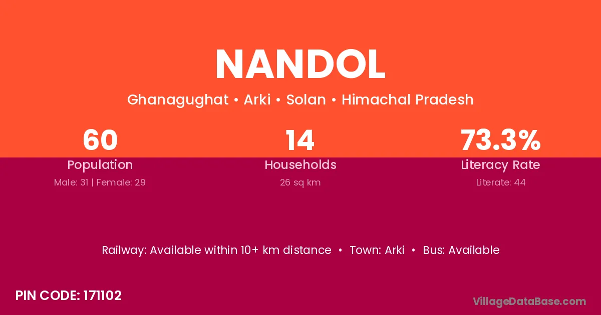 The literacy rate of Nandol village is 60.06%. Male literacy stands at 69.09% and female literacy at 51.06%.