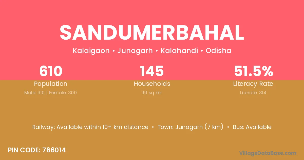 Sandumerbahal village has a total population of 610 people, of which 310 are males and 300 are females.