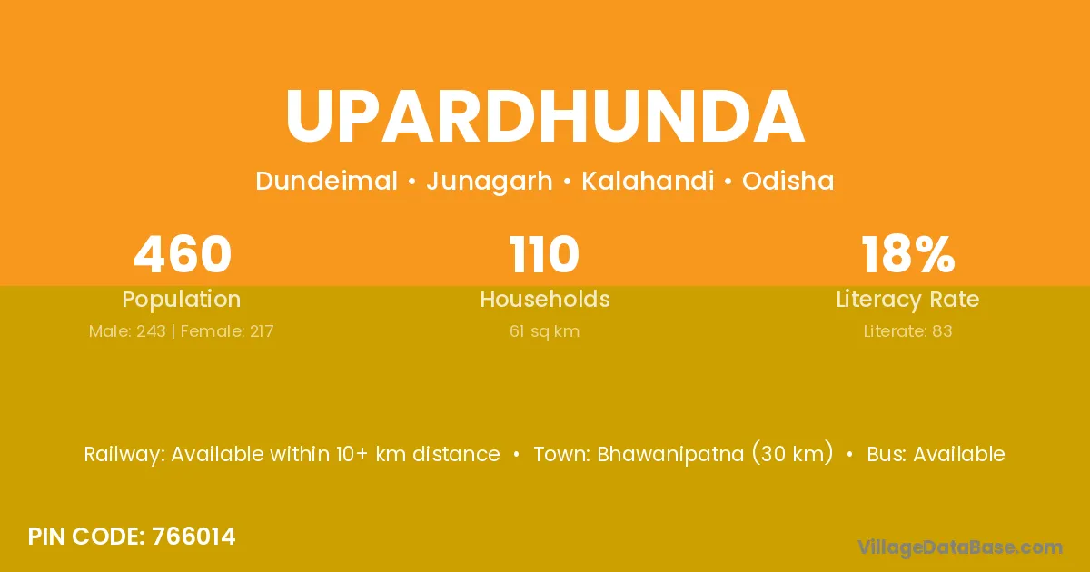 Bhawanipatna (30 km) is the nearest town to Upardhunda village for major economic activities and is located approximately 30 km away.