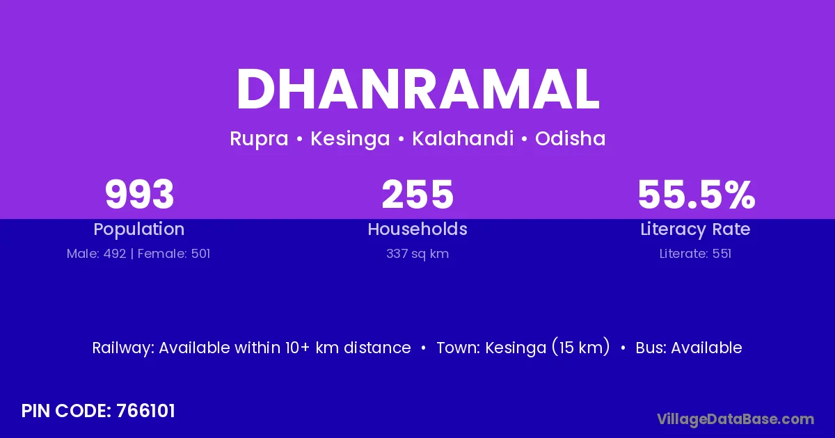 Bhawanipatna (42 km) is the nearest town to Dhanramal village for major economic activities and is located approximately 42 km away.