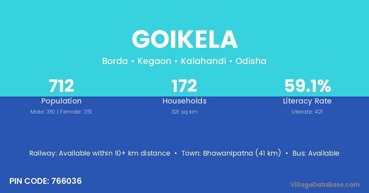 Bhawanipatna (41 km) is the nearest town to Goikela village for major economic activities and is located approximately 41 km away.