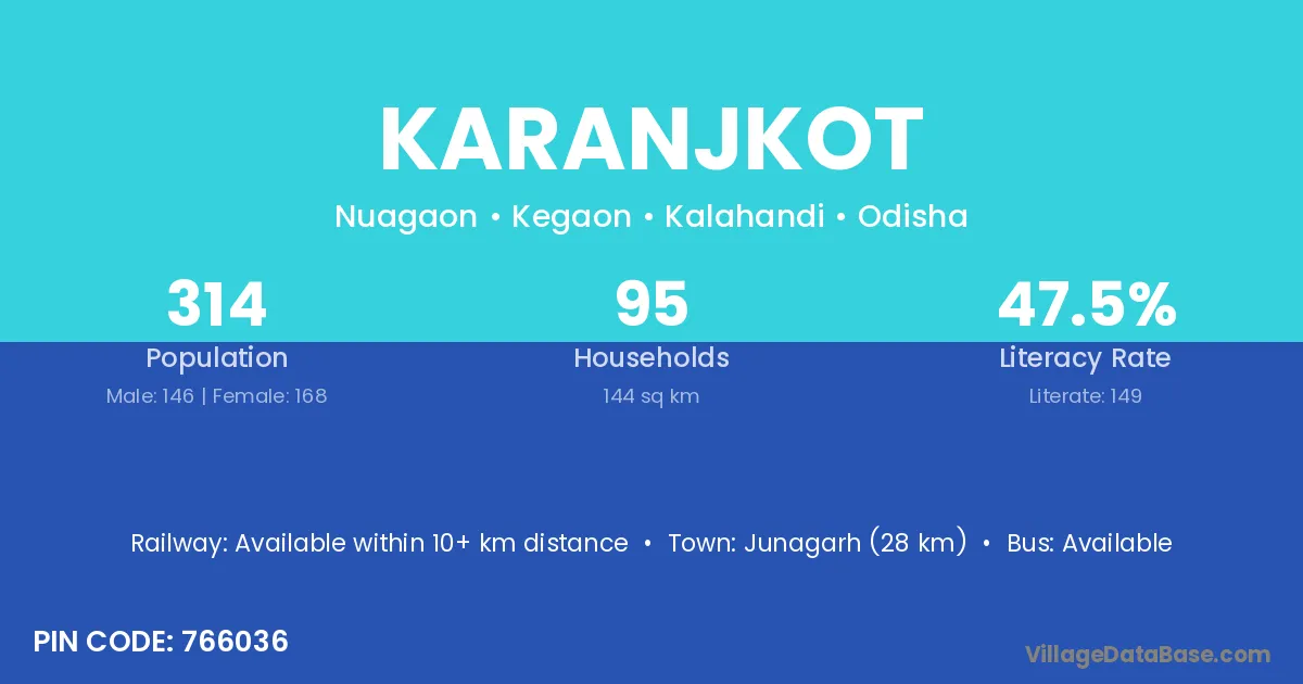 Junagarh (28 km) is the nearest town to Karanjkot village for major economic activities and is located approximately 28 km away.