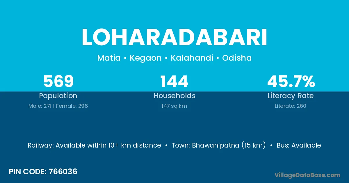 Bhawanipatna (15 km) is the nearest town to Loharadabari village for major economic activities and is located approximately 15 km away.